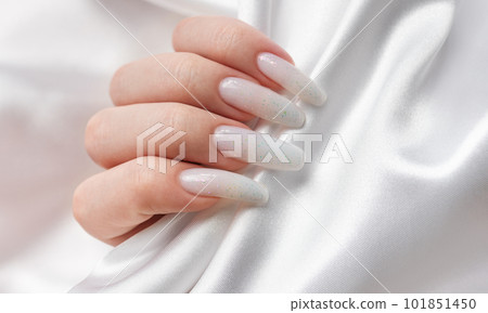 Stock Photo: A woman's hands with a manicure on them, the nails are painted in a white color.