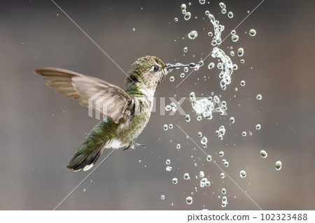 Stock Photo: Beautiful Immature Male Anna's Hummingbird Enjoying The Water Fountain