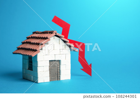Stock Photo: House and red arrow down. Falling housing prices. Unprofitability of investments, price fall in the real estate market. Lowering demand, construction rates and trends. Expensive mortgage.