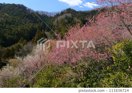Stock Photo: Ouchizawa Hanamomo no Sato, Higashichichibu Village, Chichibu District, Saitama Prefecture: Peach blossoms and other flowers blooming in abundance on the slopes of a rural mountain area in early spring