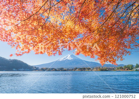 "Yamanashi Prefecture" Lake Kawaguchi and Mt. Fuji in autumn