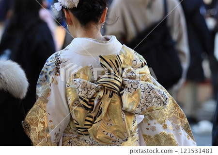 Stock Photo: Back view of a woman wearing a kimono, a woman wearing a furisode, a woman wearing formal attire for the first shrine visit of the year
