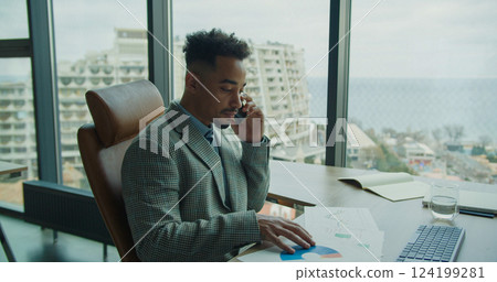 Stock Photo: A professional businessman analyzing charts and data while on a phone call in a modern office with large windows and an urban cityscape view.