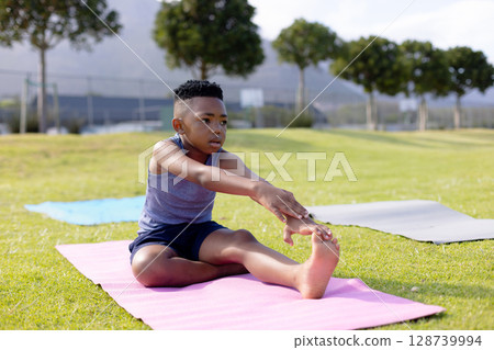 Stock Photo: African American boy child performing forward leg stretch on grassy field, with pink yoga mat