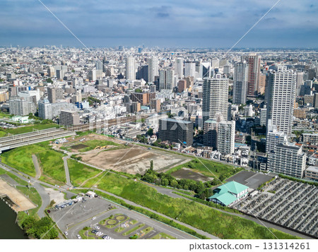 Aerial view of Kawaguchi city center taken from the Arakawa riverbed in Saitama Prefecture