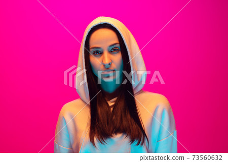 Caucasian beautiful woman's portrait isolated on pink studio background in multicolored neon light