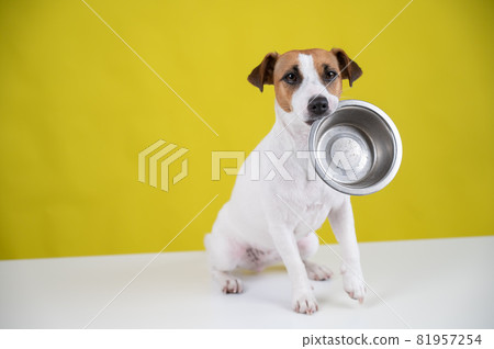 Hungry jack russell terrier holding an empty bowl on a yellow background. The dog asks for food.