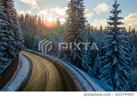 Aerial view of winter landscape with snow covered mountain hills and winding forest road in morning.