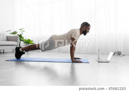 Glad young black bearded athlete guy in white sports form makes push up, plank