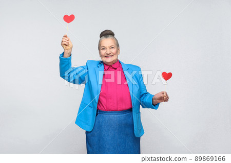 Stock Photo: happy aged woman holding two red heart sign. Portrait of beautiful happy and satisfied grandmother in light blue suit with collected gray hair bun hairstyle. Studio shot, isolated on gray background