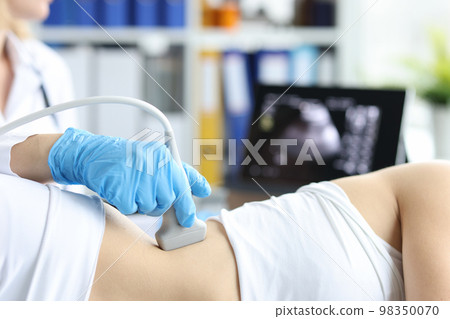 Doctor examines patient with prolapse of left kidney and spleen using ultrasound probe